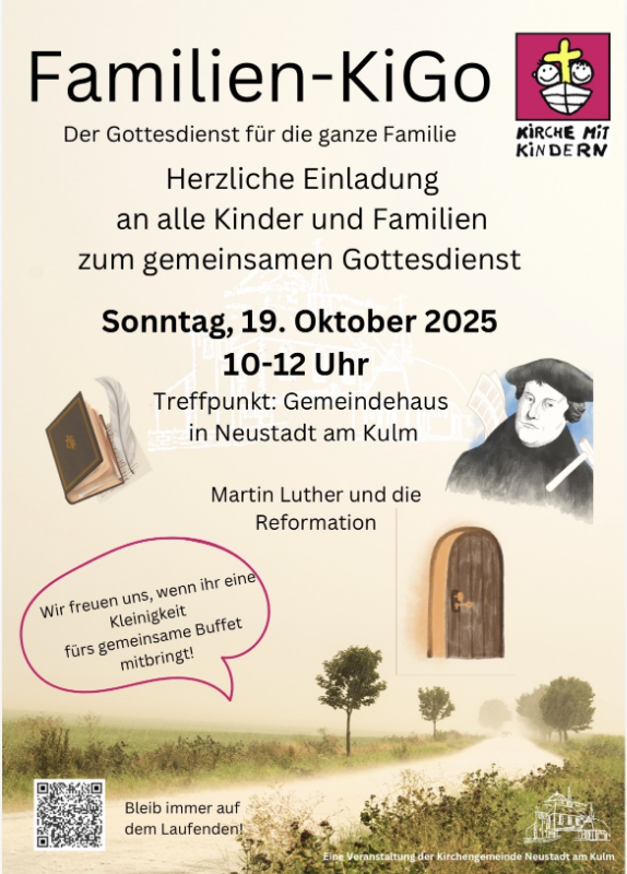 Am Sonntag, den 19. Oktober 2025, laden wir wieder herzlich zum Familien-KiGo ein. Von 10 bis 12 Uhr feiern wir im Gemeindehaus einen fröhlichen Gottesdienst für Groß und Klein.