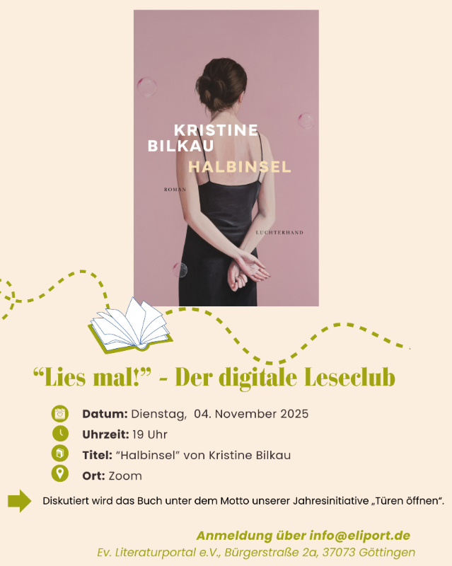 Die Bücherei unserer Kirchengemeinde ist Partner von Eliport – dem evangelischen Literaturportal. Eliport präsentiert regelmäßig ein Gewinnerbuch, das besonders empfohlen wird. Dieses Jahr geht es um das Werk von Kristine Bilkaus „Halbinsel", das dieses Jahr den Preis der Leipziger Buchmesse gewonnen hat.