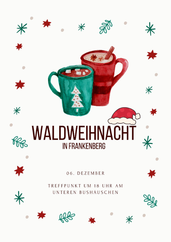 Am 6. Dezember treffen wir uns um 18 Uhr am unteren Bushäuschen in Frankenberg und gehen gemeinsam in den Wald. Dort erwarten uns Lichter, ein kurzer Impuls zum Advent und ein gemütliches Beisammensein mit Glühwein und Kinderpunsch.