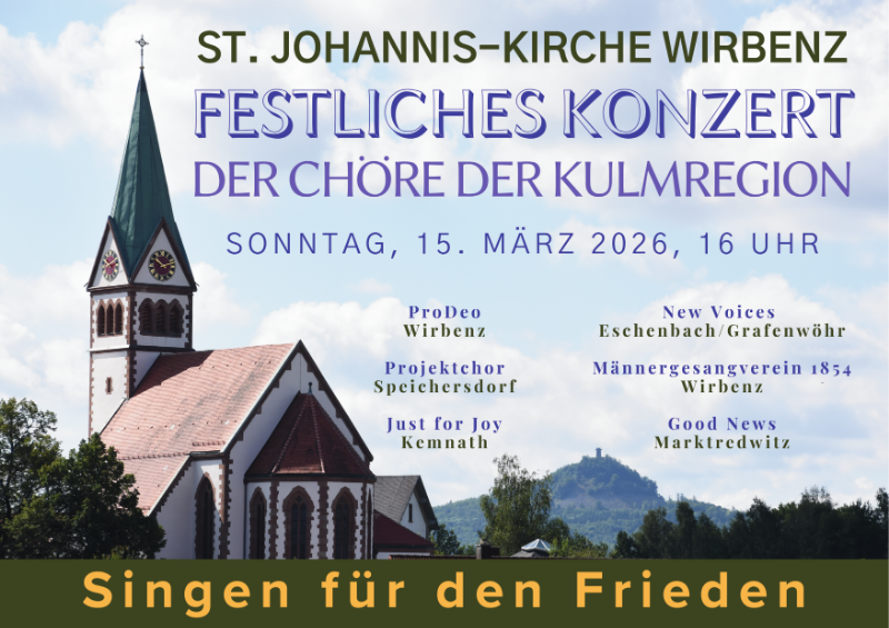 Am Sonntag, 15. März 2026, um 16 Uhr laden die Chöre der Kulmregion zu einem festlichen Konzert in die St. Johannis Kirche Wirbenz ein. Als Nachbargemeinde weisen wir gern auf diese besondere musikalische Begegnung hin.