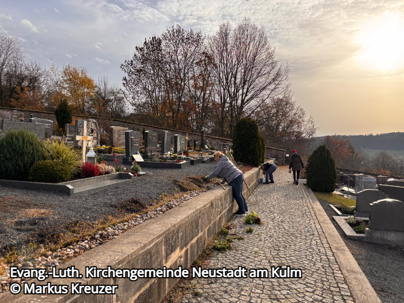 Bei unserer Herbstaktion am Friedhof in Neustadt waren leider nur wenige Helferinnen und Helfer dabei. Dadurch ist manches liegen geblieben, auch wenn wir uns viel vorgenommen hatten. Der Pflegeaufwand ist für den Kirchenvorstand allein schlicht zu groß, deshalb freuen wir uns künftig über jede Unterstützung.