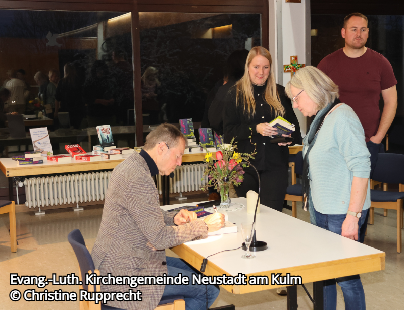 In der Pause und nach der Lesung war der Autor gerne bereit, seine Bücher zu signieren, während die Gäste sich mit kleinen Snacks und Getränken stärken konnten.